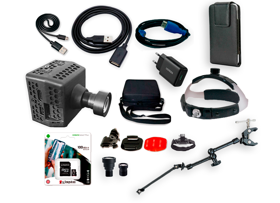 Você pode fixar no suporte para cabeça, foco cirúrgico, fotóforos e lupas, conectar à TV e controlar facilmente pelo aplicativo (iPhone/Android).